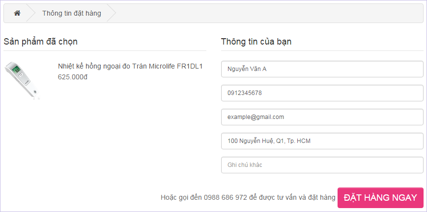 Hệ thống sẽ tự động chuyển về trang Thông tin đặt hàng. Bạn vui lòng điền các thông tin cá nhân như mẫu trong hình để VeganDay vận chuyển hàng đến tay bạn. Sau đó nhấn chọn ĐẶT HÀNG NGAY